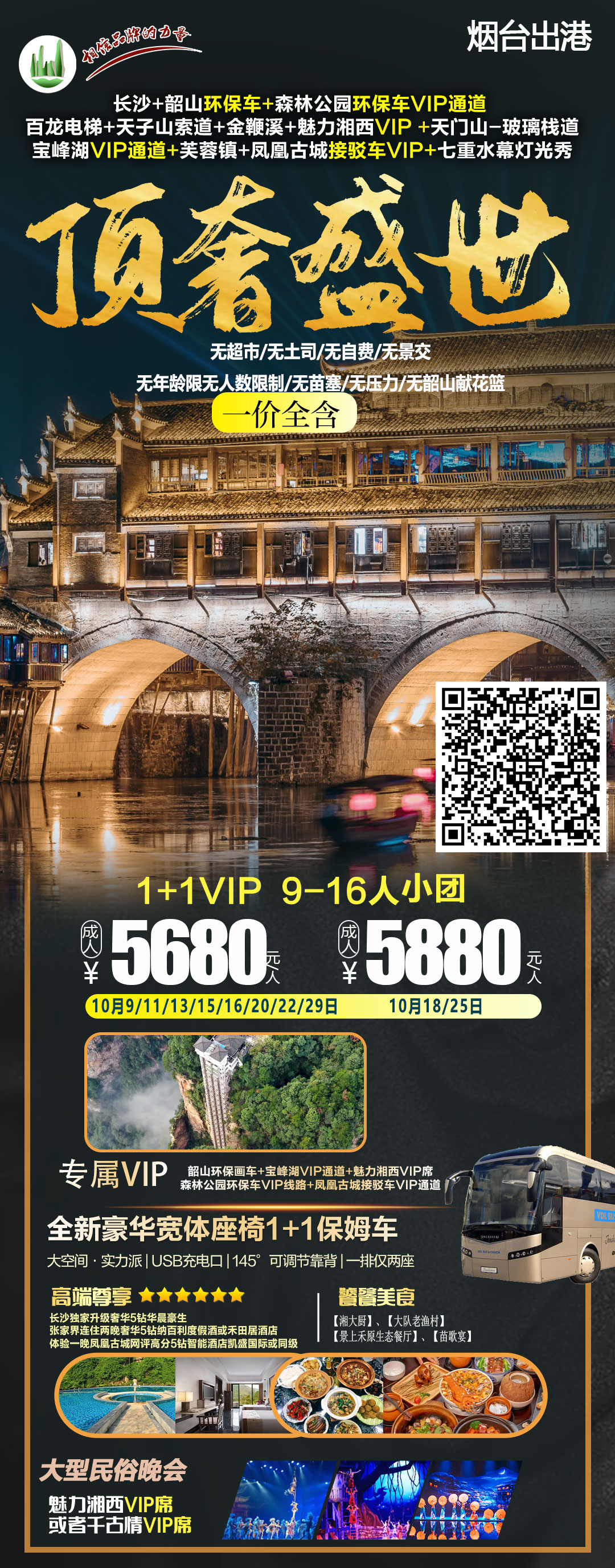 1、门票:门票:含韶山电瓶车、张家界国家森林公园(百龙电梯VIP包梯+天子山索道下+景区VIP绿通+航拍),宝峰湖(VIP+游船)、《魅力湘西超级VIP席》,天门山(玻璃栈道)、芙蓉镇、凤凰古城(三景+VIP接驳车+苗汉服体验)